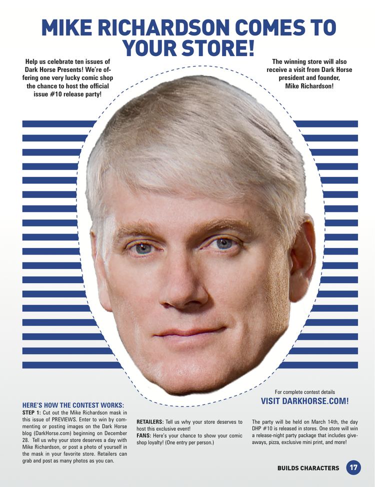 Mike Richardson (born June 29, 1950) is an American publisher, writer, and Emmy-winning producer. In 1986, he founded Dark Horse Comics, an award-winning international publishing house located in Milwaukie, Oregon. Richardson is also the founder and President of the Things From Another World retail chain and president of Dark Horse Entertainment, which has developed and produced numerous projects for film and television based on Dark Horse properties or licensed properties. In addition, he has written numerous graphic novels and comics series, including The Secret, Living with the Dead, and Cut as well as co-authoring two non-fiction books: Comics Between the Panels and Blast Off!. [source](https://en.wikipedia.org/wiki/Mike_Richardson_(publisher)