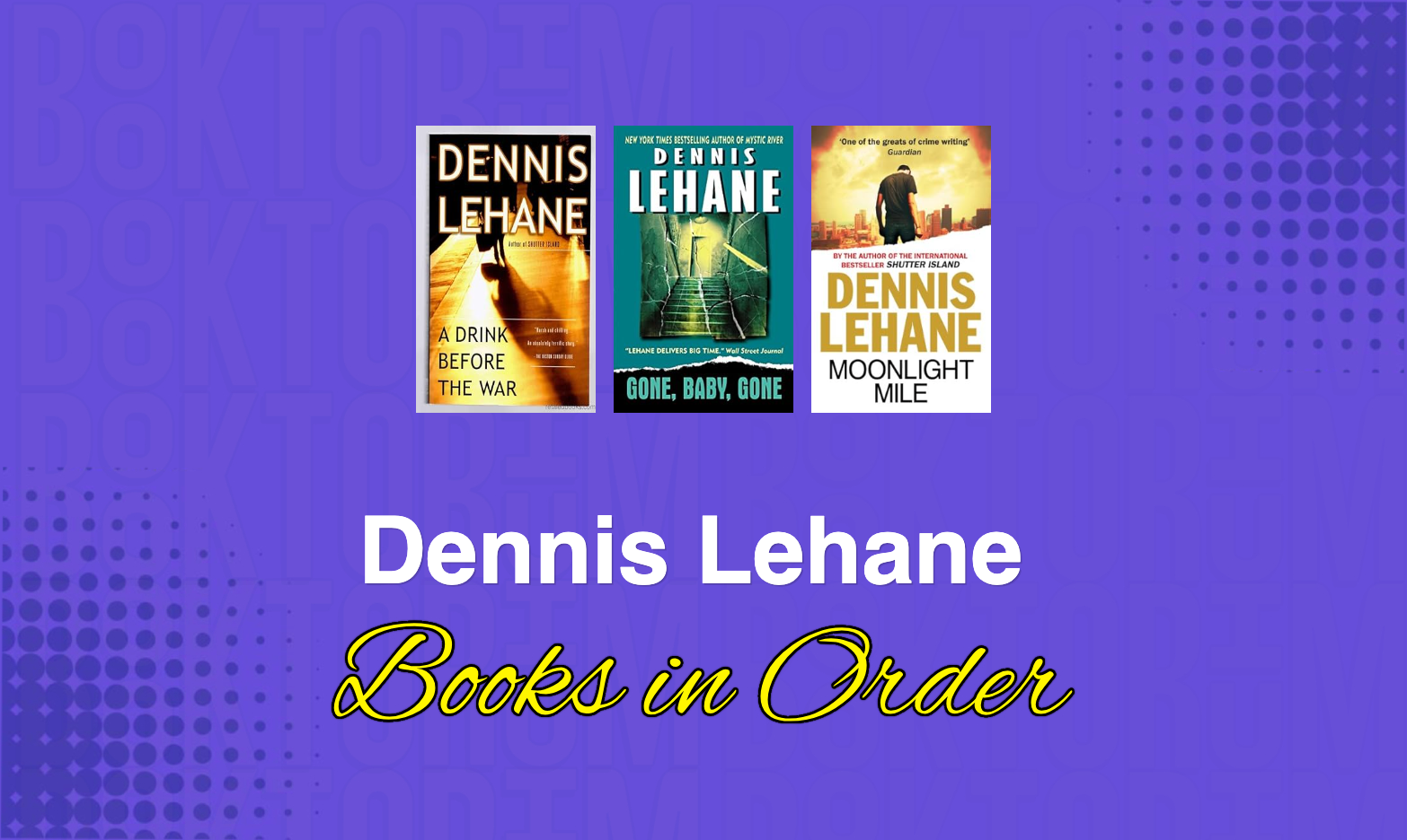 Dennis Lehane is an American author. He has published more than a dozen novels; the first several were a series of mysteries featuring recurring characters, including *A Drink Before the War*. Four of his novels were adapted into award-wining films of the same names: *Mystic River* (2003), *Shutter Island* (2010), and *Gone Baby Gone* (2007) and *Live by Night* (2016). [*--Wikipedia*](https://en.wikipedia.org/wiki/Dennis_Lehane)