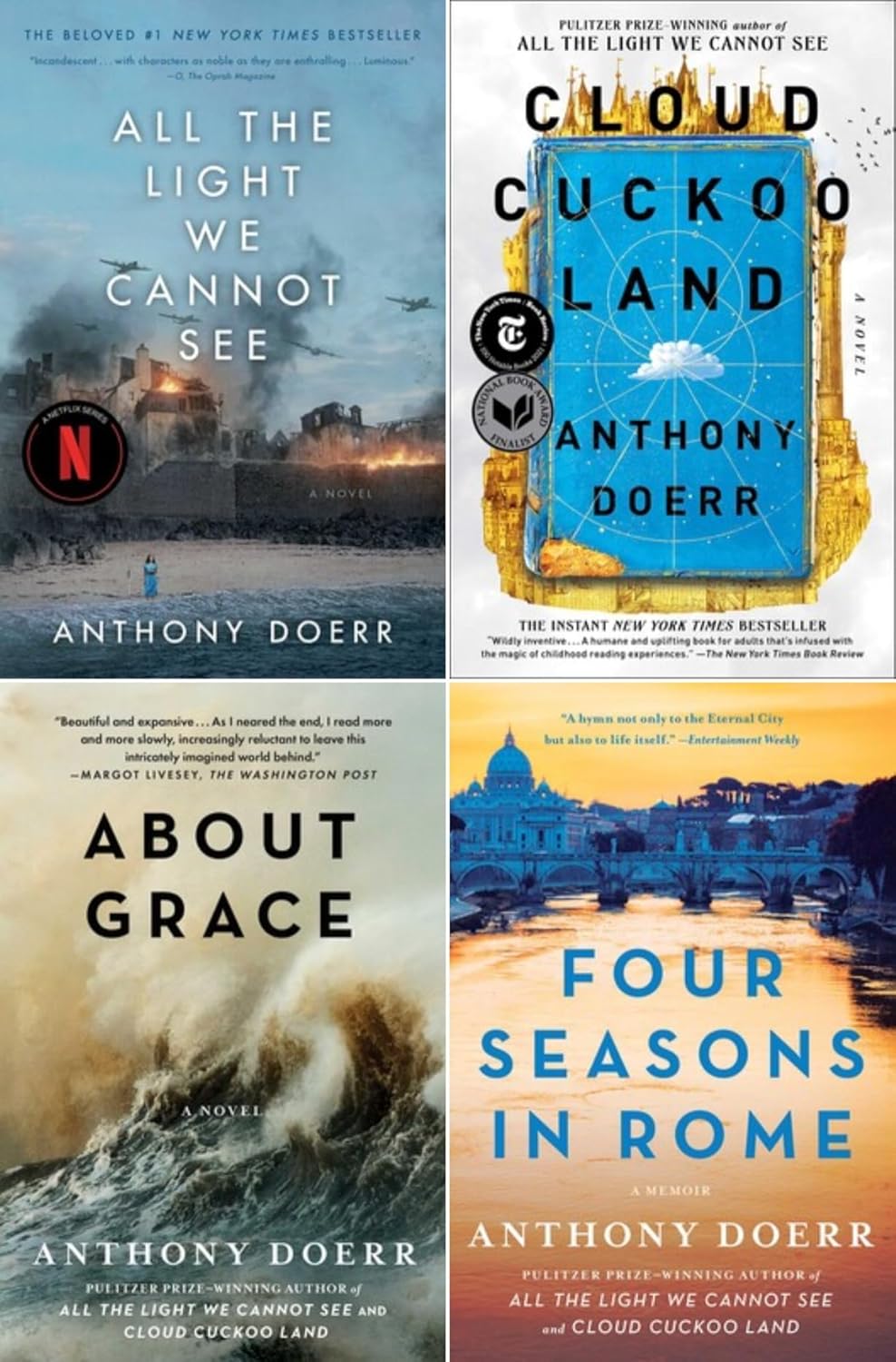 Anthony Doerr was born and raised in Cleveland, Ohio. He is the author of the story collections The Shell Collector and Memory Wall, the memoir Four Seasons in Rome, and the novels About Grace and All the Light We Cannot See, which was awarded the 2015 Pulitzer Prize for fiction and the 2015 Andrew Carnegie Medal for Excellence in Fiction. Doerr’s short stories and essays have won four O. Henry Prizes and been anthologized in The Best American Short Stories, New American Stories, The Best American Essays, The Scribner Anthology of Contemporary Fiction, and lots of other places. His work has been translated into over forty languages and won the Barnes & Noble Discover Prize, the Rome Prize, the New York Public Library’s Young Lions Award, a Guggenheim Fellowship, an NEA Fellowship, an Alex Award from the American Library Association, the National Magazine Award for Fiction, four Pushcart Prizes, two Pacific Northwest Book Awards, four Ohioana Book Awards, the 2010 Story Prize, which is considered the most prestigious prize in the U.S. for a collection of short stories, and the Sunday Times EFG Short Story Award, which is the largest prize in the world for a single short story. All the Light We Cannot See was a #1 New York Times bestseller, and remained on the hardcover fiction bestseller list for 134 consecutive weeks. Doerr lives in Boise, Idaho with his wife and two sons. A number of media interviews with him are collected here. Though he is often asked, as far as he knows he is not related to the late writer Harriet Doerr. ([source][1]) [1]: http://anthonydoerr.com/biography/